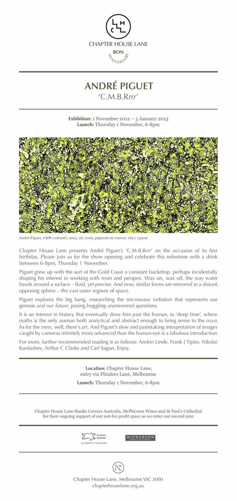 André Piguet ‘C.M.B.Rrrr’ 10 Nov Written By Amy Rudder Exhibition invitation for Piguet’s Chapter House Lane show. Amy Rudder