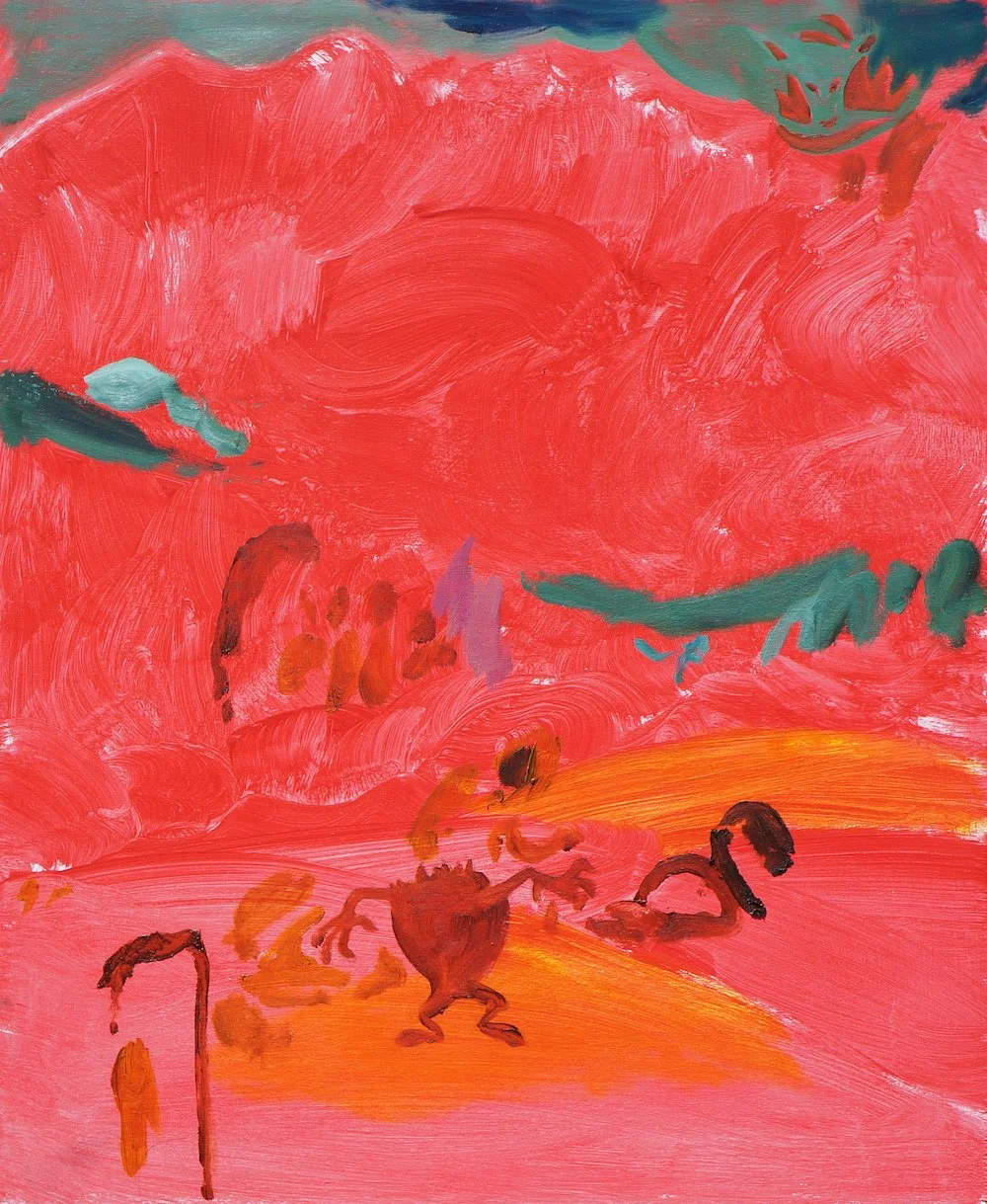 Rough brushstrokes of blood-orange and a cerulean green skyline – the kind of wrong colours the world turns when it’s ablaze. A creature – warped, cartoonish – haunting the foreground; a memento mori, the devil itself descending? It felt that Freud’s unheimlich (literally, unhomely, or ‘uncanny’) was there on the canvas and here in my body, and I found myself searching google for the long-forgotten essay, to revisit Freud’s diagnosis of the phenomenon.
