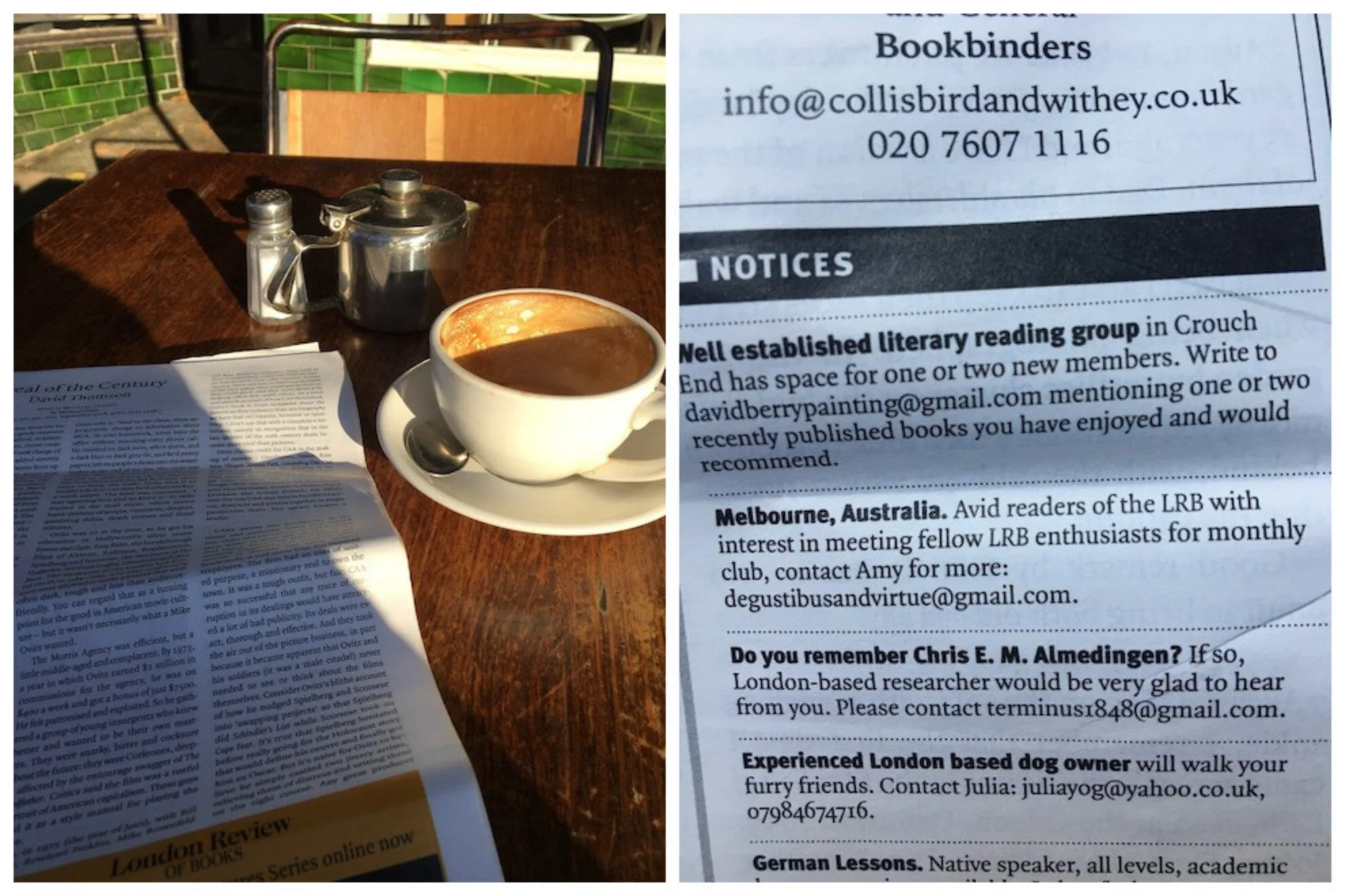I decided to place an ad in the LRB’s famed classifieds. Not in the ‘Personals’ (Sexually, I’m more of a Switzerland), lest someone think I was suggesting a veritable orgy, but the truly neutral ‘Notices’ section. In the tradition of classified ads, I kept it short and sweet, giving great thought to the punctuation, even staying up late one night to phone Ellie in Sales to make payment.