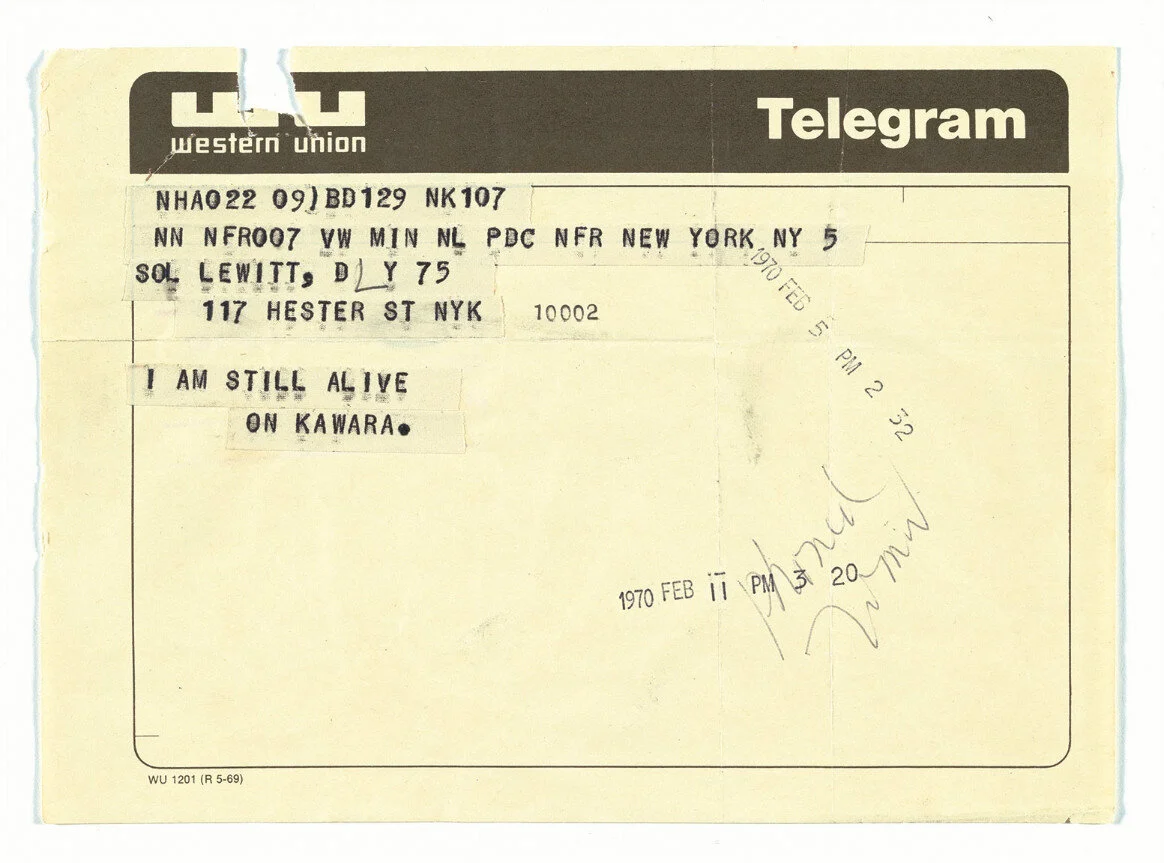The everyday was something Kawara lived with unusual commitment. In his Date Paintings (the Today series), and companion series – I Went, I Met and I Got Up At, Kawara meticulously makes traces of his everyday existence. His long-running series I Am Still Alive, consists of telegrams sent from the many, many places to which he travelled, conveying the single statement to friends: ‘I am still alive’.